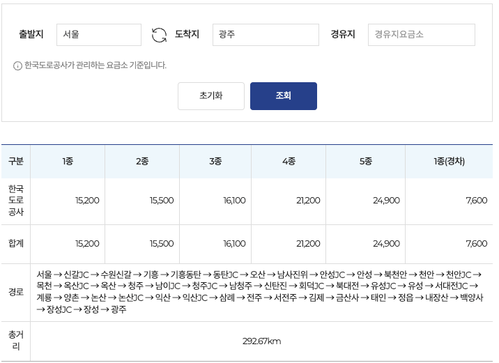 한국 도로공사 홈페이지에서 안내해주는 통행요금 계산기를 이용하면 가고자 하는 출발지와 목적지, 경유지 입력만으로 통행요금을 조회해볼 수 있습니다.