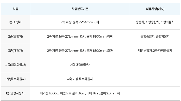 고속도로 통행요금은 차종별 차등 적용되기 때문에 자신의 차량이 어디에 해당되는지도 미리 알아두시면 좋습니다.