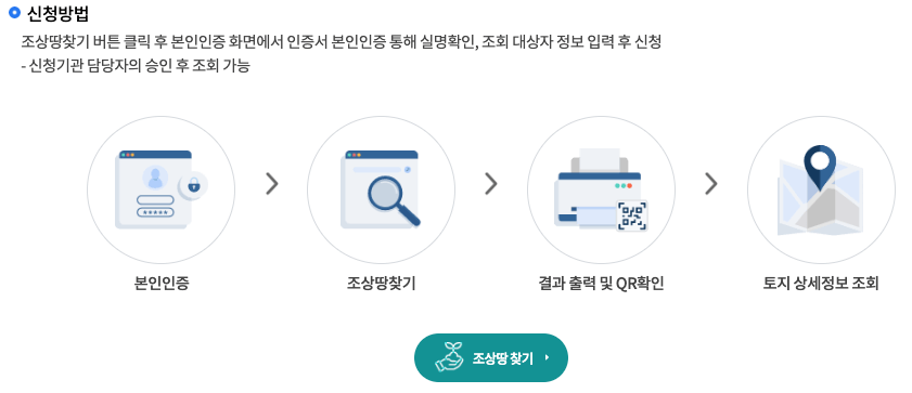 상속인에게 토지 소재지를 알려주는 조상땅 찾기 서비스는 온라인과 오프라인으로 재산 상속인이 직접 신청하실 때 조회가 가능합니다. 재산관리에 소홀했거나 불의의 사고로 갑작스럽게 토지 소유자가 돌아가신 경우 부동산 소유 현황이 상속인에게 공유되어 있지 않았다면 상속인은 부동산 현황에 대해 아무것도 모르는 상황이 됩니다. 때문에 이런 경우 조상땅 찾기 서비스를 이용해 보시면 조회가 가능합니다.