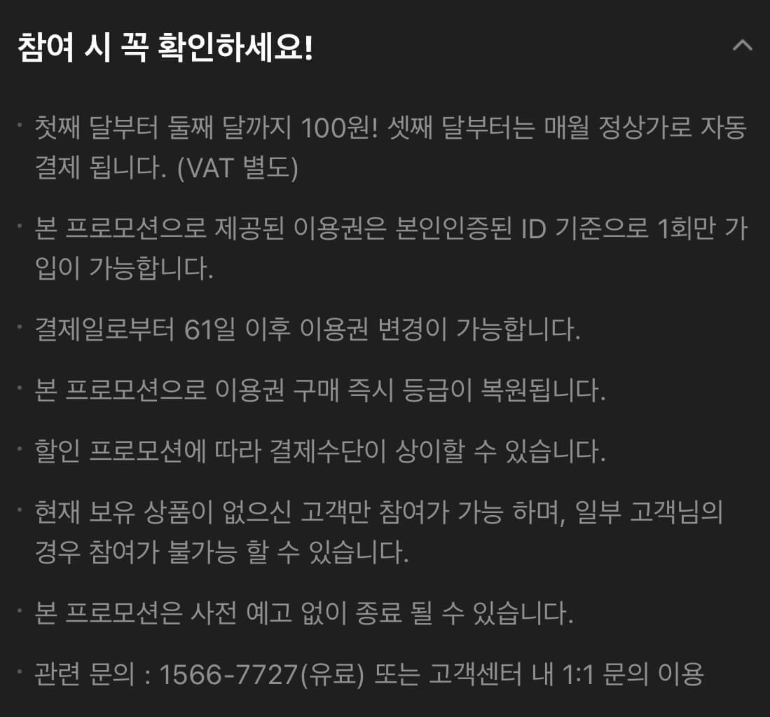 결국 100원 이용권을 이용하게 된다면 셋째 달까지는 사용해야 하며 마지막 달은 정상가로 이용하셔야 합니다. 하지만 그렇다고 하더라도 두 달은 100원으로 이용할 수 있기 때문에 메리트가 크다고 할 수 있습니다. 또한 100원 이용권 사용 중에 다른 이용권으로 변경하거나 해지할 경우 이후부터 더 이상 할인 혜택이 주어지지 않습니다.