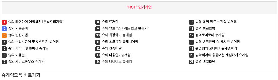 쥬니어 네이버에 있던 슈게임이 사라졌지만 슈의 인간공장이나 초코 만들기, 외출 준비, 초코 공장 등의 게임을 할 수 있는 곳이 있습니다. 아래 슈게임 링크 모음을 통해 빠르게 이동하실 수 있습니다.