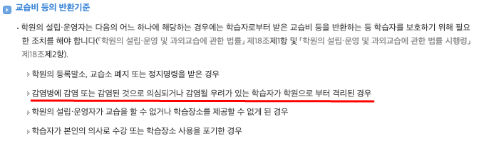 코로나에 의한 학원 수강료 환불 기준