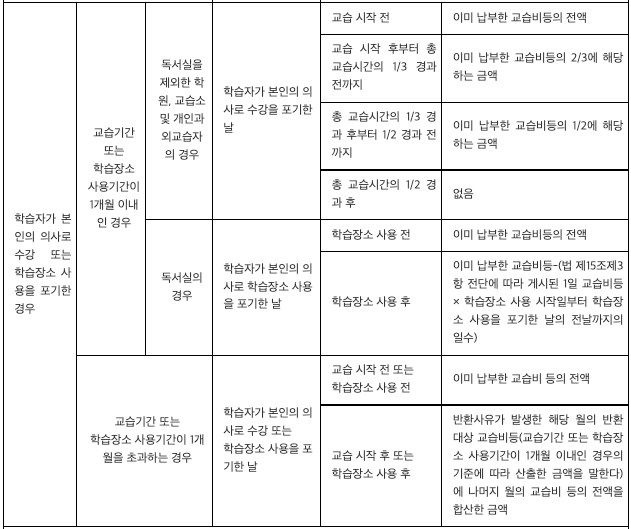 본인 사유에 의한 학원비 환불
