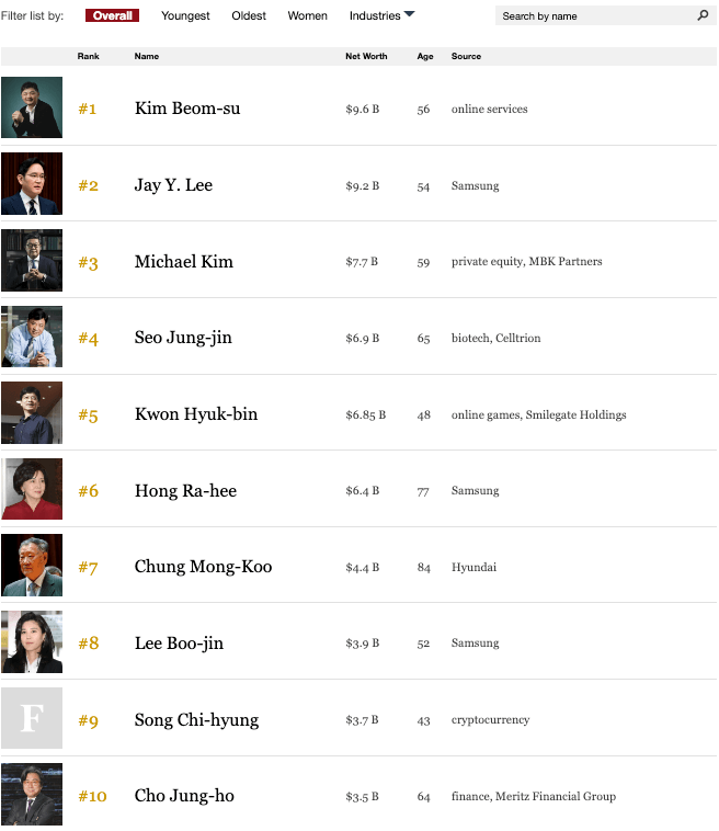 2022 포브스에서 발표한 한국 부자 순위에 대해 살펴보겠습니다. 영어로 korea's Richest People라고 표현하고 있는데요. 전체 순, 나이순, 여성별로 필터링해서 한국 부자 순위를 확인해보실 수 있습니다.